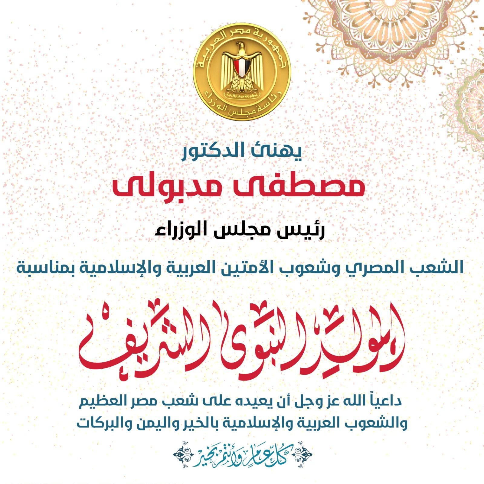 هنأ الدكتور مصطفى مدبولي رئيس الوزراء، الشعب المصري والأمة العربية والإسلامية بمناسبة المولد النبوي الشريف