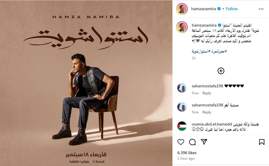 يستعد الفنان حمزة نمرة، لطرح أحدث أعماله الغنائية التي تحمل اسم «استنوا شوية» وكشف عن موعد طرحها ، عبر حسابه الرسمي بموقع تداول الصور والفيديوهات «إنستجرام» .