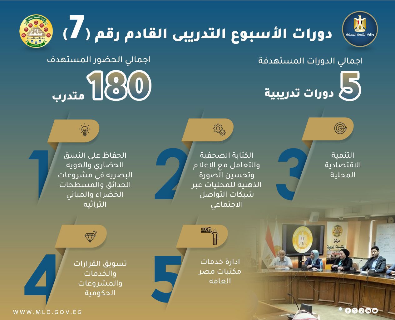 وأكدت الدكتورة منال عوض أن الأسبوع السابع سيشهد تنظيم 5 دورات تدريبية منها 3 دورات جديدة تنفذ لأول مرة وهي دورة "الحفاظ على النسق الحضاري والهوية البصرية في مشروعات الحدائق والمسطحات الخضراء والمباني التراثية " وذلك لمديري إدارات التنسيق الحضاري والتخطيط العمراني والإدارة الهندسية وإدارة المشروعات بالتعاون مع الجهاز القومي للتنسيق الحضاري، ودورة "التنمية الاقتصادية المحلية" لرؤساء المراكز والمدن والأحياء ونوابهم بالتعاون مع برنامج التنمية المحلية بصعيد مصر بالوزارة ومشروع الدعم الفني UNDP، والفئة المستهدفة مدير عام التخطيط وفرق التنمية الاقتصادية وإدارة الاستثمار وفريق التكتلات الاقتصادية بالمحافظات ودورة "تسويق القرارات والخدمات والمشروعات الحكومية" لرؤساء الوحدات القروية وسكرتيرى مجالس المدن والأحياء، كما يشهد الأسبوع السابع تنظيم دورة "الكتابة الصحفية والتعامل مع الإعلام وتحسين الصورة الذهنية للمحليات عبر شبكات التواصل الاجتماعي" للمديرين والعاملين بإدارات العلاقات العامة والإعلام والبوابات الالكترونية بالتعاون مع وحدة تطوير الإدارة المحلية بالوزارة ووكالة ال GIZ الألمانية إضافة إلي الأسبوع الثاني والأخير لدورة "إدارة خدمات مكتبات مصر العامة" للمديرين والعاملين بمكتبات مصر العامه الرئيسية والفرعية بالتعاون مع مكتبة مصر العامة ووحدة تكافؤ الفرص بالوزارة، ويبلغ إجمالي عدد المستفيدين من دورات هذا الأسبوع 180 متدرباً.