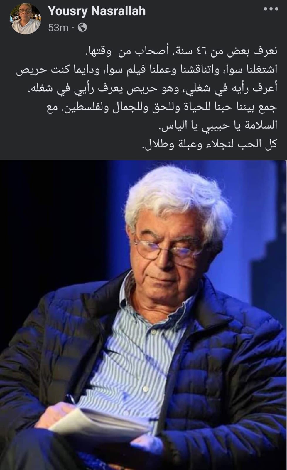 نشر يسري نصر الله صورة إلياس خوري على صفحته الرسمية عبر موقع التواصل الاجتماعي "فيسبوك" وعلق قائلا : "نعرف بعض من 46 سنة أصحاب من وقتها، اشتغلنا سوا واتناقشنا وعملنا فيلم سوا، ودايما كنت حريص أعرف رأيه في شغلي، وهو حريص يعرف رأيي في شغله" .