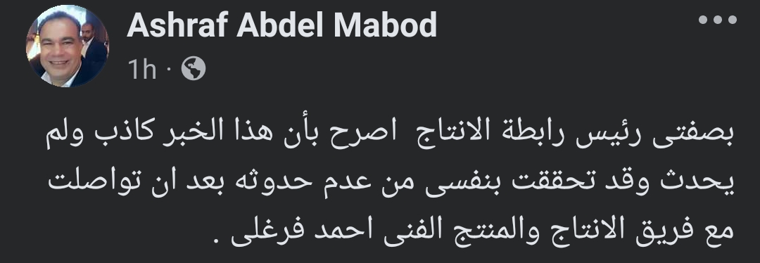 كتب أشرف عبد المعبود منشور على صفحته الرسمية عبر موقع التواصل الاجتماعي "فيسبوك" وعلق قائلا : "بصفتي رئيس رابطة الإنتاج أصرح بأن هذا الخبر كاذب ولم يحدث، وقد تحققت بنفسي من عدم حدوثه بعد أن تواصلت مع فريق الإنتاج والمنتج الفني أحمد فرغلي" .