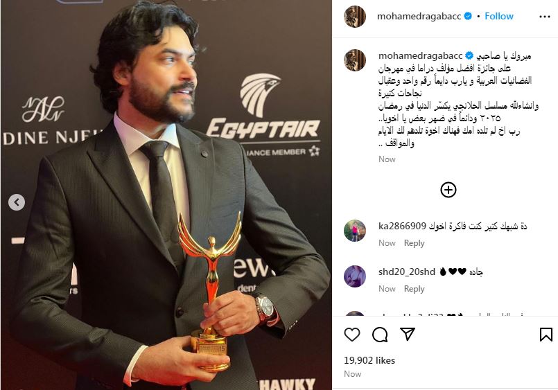ونشر محمد رجب صورة عبر صفحته الرسمية "إنستجرام" تجمعه بالمؤلف محمود حمدان وعلق عليها" مبروك يا صاحبي على جائزة أفضل مؤلف دراما في مهرجان الفضائيات العربية و يارب دايماً رقم واحد وعقبال نجاحات كثيرة، وإن شاء الله مسلسل الحلنجي يكسّر الدنيا في رمضان 2025، ودائماً في ضهر بعض يا أخويا، رب أخ لم تلده أمك فهناك أخوة تلدهم لك الأيام والمواقف "
