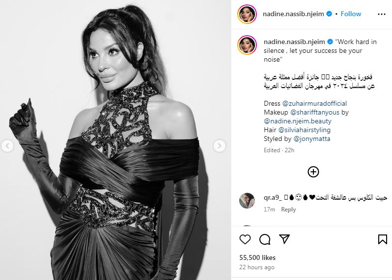 ونشرت نادين صور ومقاطع فيديو من جلسة تصوير بإطلالتها وعلقت عليها" فخورة بنجاح جديد جائزة أفضل ممثلة عربية عن مسلسل ٢٠٢٤ في مهرجان الفضائيات العربية" .