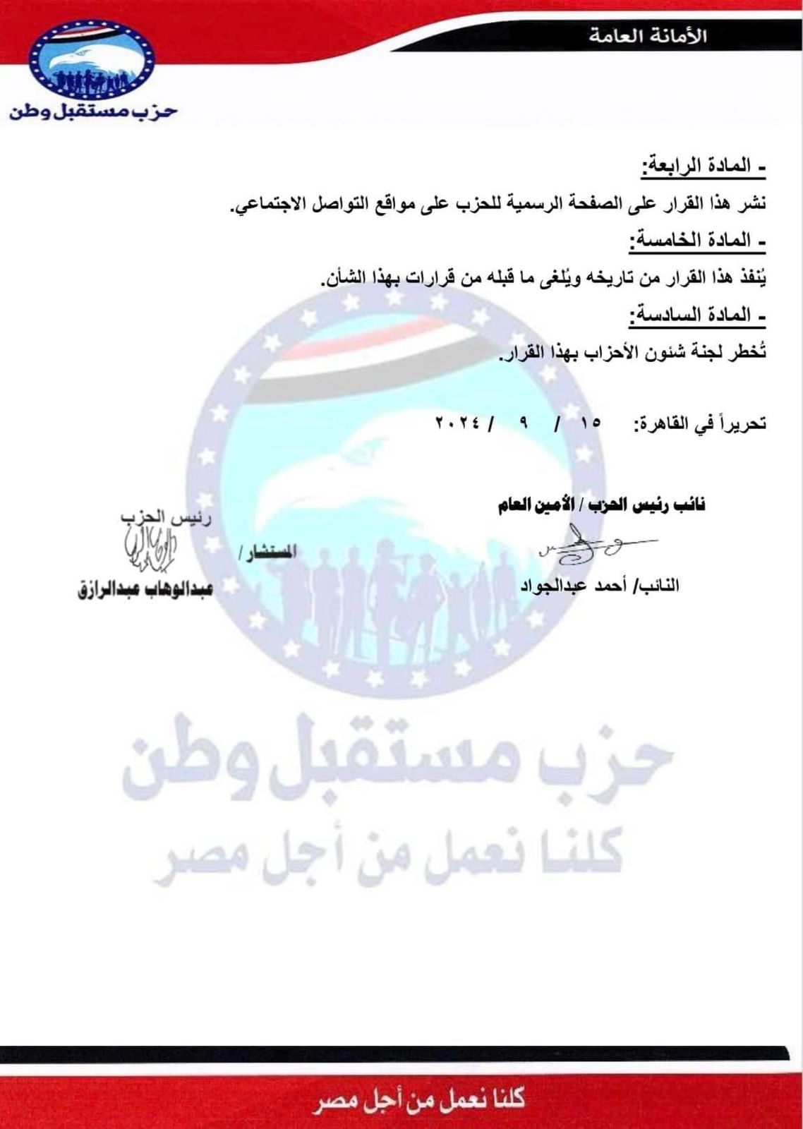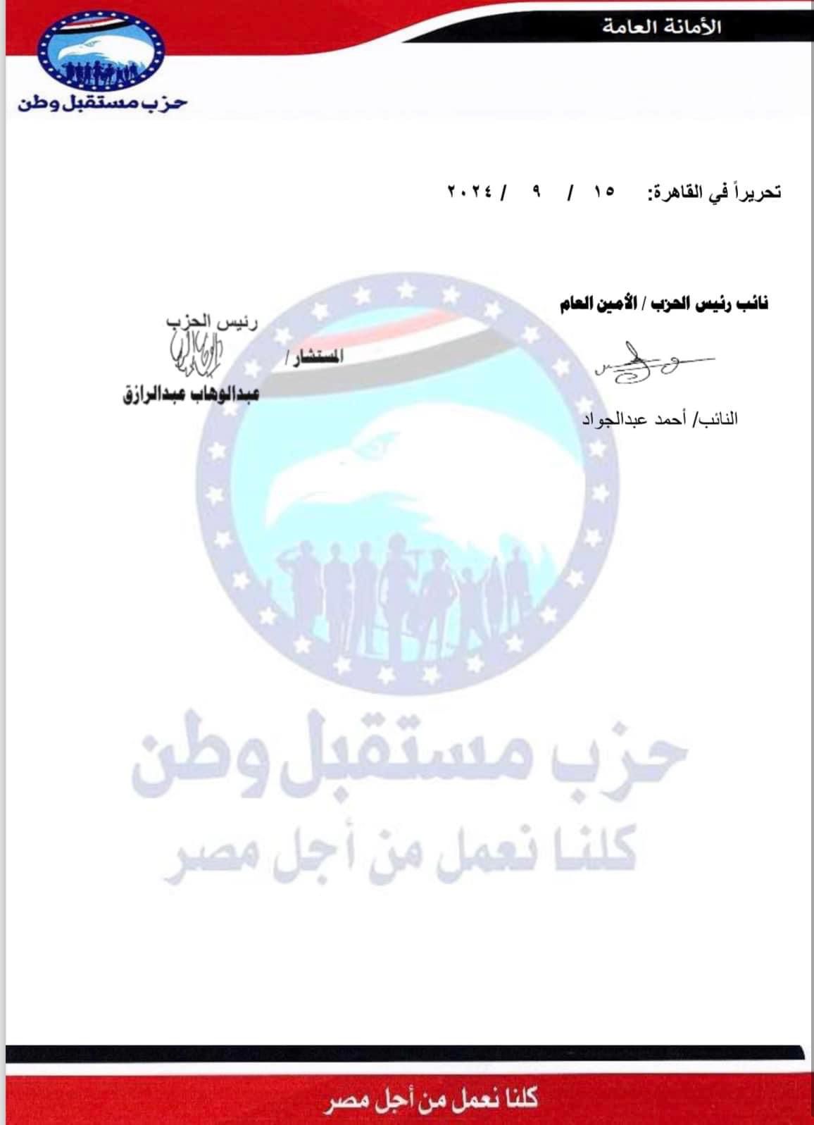عقد المكتب السياسي لحزب مستقبل وطن عقب انتهاء اجتماع الهيئة العليا للحزب اجتماعًا برئاسة المستشار عبدالوهاب عبدالرازق "رئيس الحزب"، والذي أسفر عنه عدد من القرارات التنظيمية على النحو التالي: