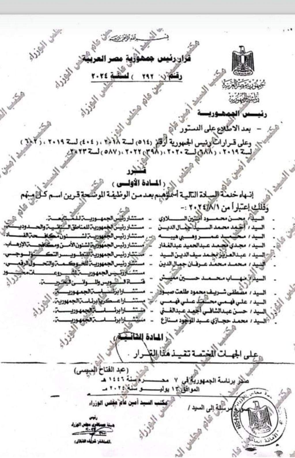 وجاء قرار رئيس الجمهورية بإنهاء خدمة المستشارين المذكورين، بعد الاطلاع على الدستور وعلى قرارات رئيس الجمهورية أرقام (514) لسنة 2018، و(404) لسنة 2019، و(602) لسنة 2019، و(688) لسنة 2020، و(398) لسنة 2022، و(587) لسنة 2023، مءكدًا على الجهات المختصة تنفيذ هذا القرار.