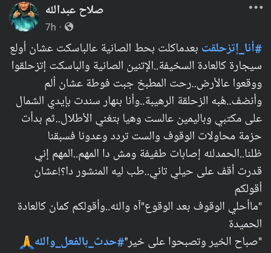 كتب صلاح عبد الله منشورا على صفحته الرسمية عبر موقع التواصل الاجتماعي "فيسبوك" وعلق قائلا : "أنا اتزحلقت، بعد ما كلت بحط الصنية ع الباسكت علشان أولع سيجارة كالعادة السخيفة، الإتنين الصانية والباسكت إتزحلقوا ووقعوا عالأرض..رحت المطبخ جبت فوطة عشان ألم وأنضف..هُبه الزحلقة الرهيبة..وأنا بنهار سندت بإيدي الشمال على مكتبي وباليمين عالست وهيا بتغني الأطلال" .