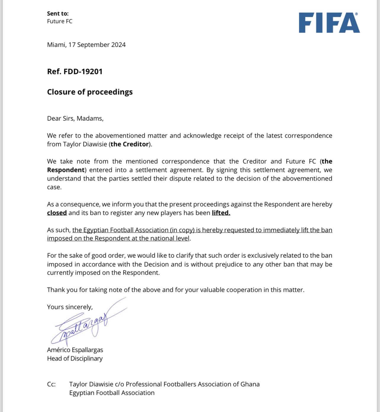 يعلن مجلس إدارة نادي مودرن سبورت برئاسة الدكتور وليد دعبس بتلقيه خطاب من الإتحاد الدولي لكرة القدم برفع إيقاف القيد عن الفريق الأول لكرة القدم بعد حل أزمة اللاعب الغاني دياويسي تايلور.