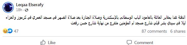 وكتبت ابنة إيمان الصيرفي في منشورها الذي نشرته عبر صفحتها والدفنة غدا بمقابر العائلة بالعمود الباب الوسطاني بالإسكندرية وصلاة الجنازة بعد صلاة الظهر في مسجد العمري في كرموز.