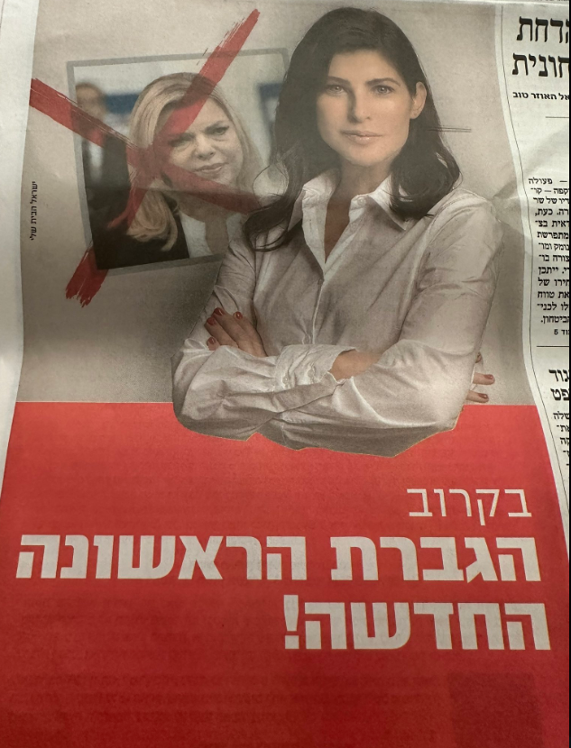 هذا الصباح، تم نشر إعلان على الصفحة الأولى للصحيفة مع صورة غيولا بن ساعر ، الصحفية وزوجة جدعون ساعر، وتحته تعليق: "قريبا السيدة الأولى الجديدة!" بينما صورة سارة نتنياهو ، السيدة الأولى الحالية، موجودة تحت علامة X حمراء كبيرة.