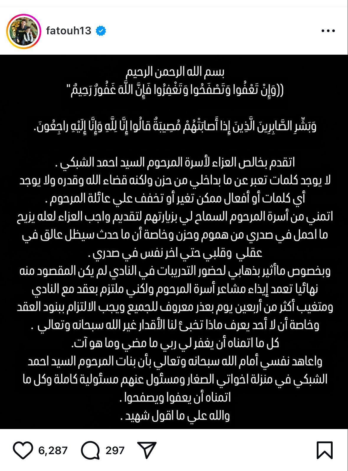 وكتب أحمد فتوح في بيان رسمي منذ قليل: بسم الله الرحمن الرحيم "وَإِنْ تَعْفُوا وَتَصْفَحُوا وَتَغْفِرُوا فَإِنَّ اللَّهَ غَفُورٌ رَحِيمٌ “ وَبَشِّرِ الصَّابِرِينَ الَّذِينَ إِذا أَصَابَتْهُمْ مُصِيبَةٌ قَالُوا إِنَّا لِلَّهِ وَإِنَّا إِلَيْهِ رَاجِعُونَ”.. أتقدم بخالص العزاء لأسرة المرحوم السيد أحمد السبكي.