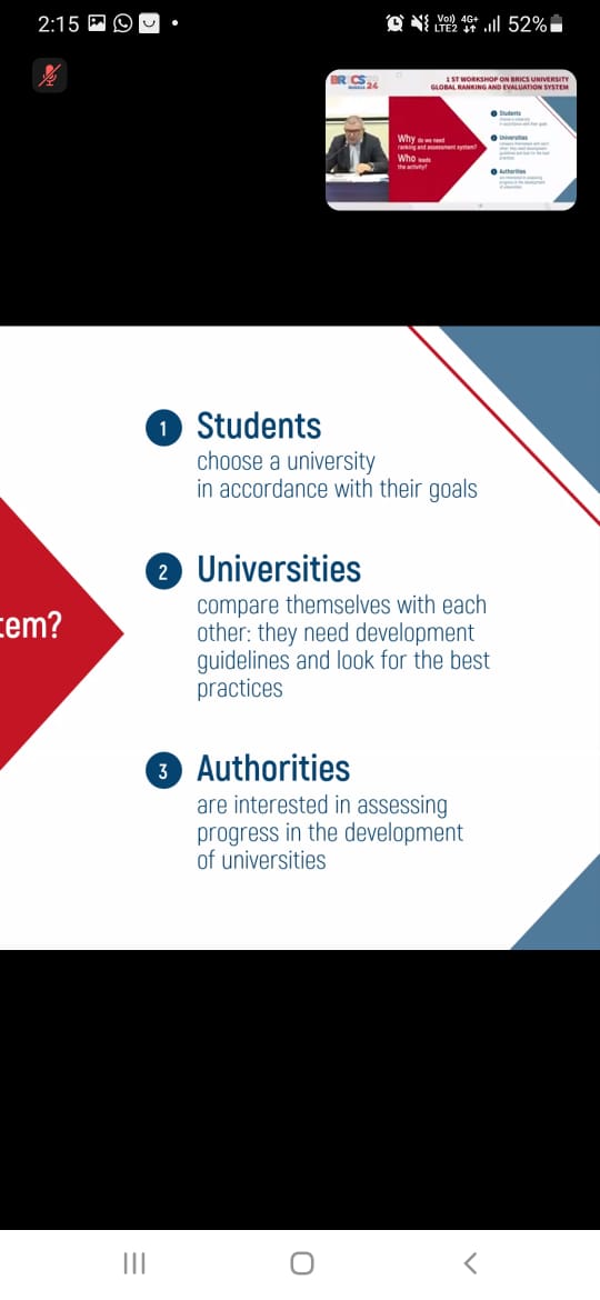 افتتحت ورشة العمل بالترحيب بالسادة الحضور من قبل كل من الدكتور دميتري جريشانكوف، الدكتورة شهيدة إسحاق، ثم واصلت ورشة العمل انعقادها حيث تضمنت الجلسة الأولى الممارسات الوطنية لتجميع واستخدام أنظمة التصنيف والتقييم للجامعات، بينما تناولت ثاني جلساتها مبادئ مجموعة البريكس في تنفيذ الأنشطة لتجميع التصنيفات العامة والتقييمات وغيرها من التقييمات لمؤسسات التعليم العالي (الجامعات).