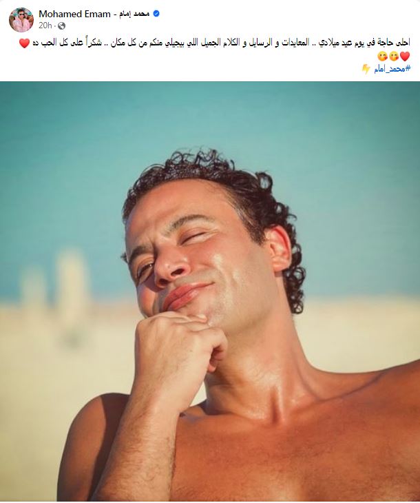 وشارك محمد إمام، صورة عبر حسابه على موقع التواصل الاجتماعي فيسبوك، معلقًا عليها: «أحلى حاجة في يوم عيد ميلاد، المعايدات والرسائل و الكلام الجميل اللي بيجيلي منكم من كل مكان، شكرًا على كل الحب ده».