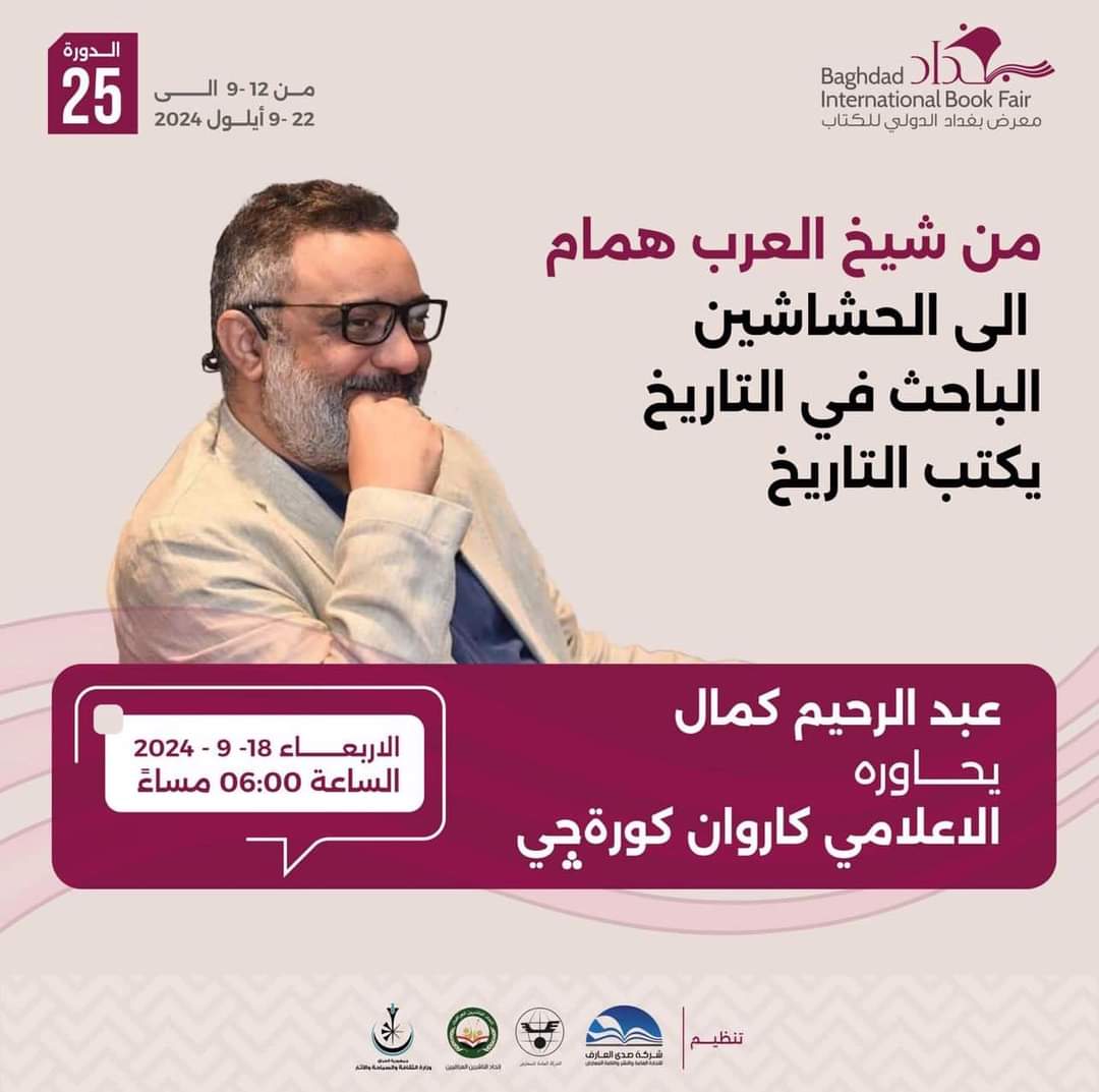 عبد الرحيم كمال.. نشرت إدارة معرض بغداد الدولي للكتاب صورة عبد الرحيم كمال على الصفحة الرسمية عبر موقع التواصل الاجتماعي "فيسبوك" وعلقت قائلة: "من شيخ العرب همام إلى الحشاشين، الباحث في التاريخ يكتب عن التاريخ ويحاوره الإعلامي كورة كاروان كورة جي".