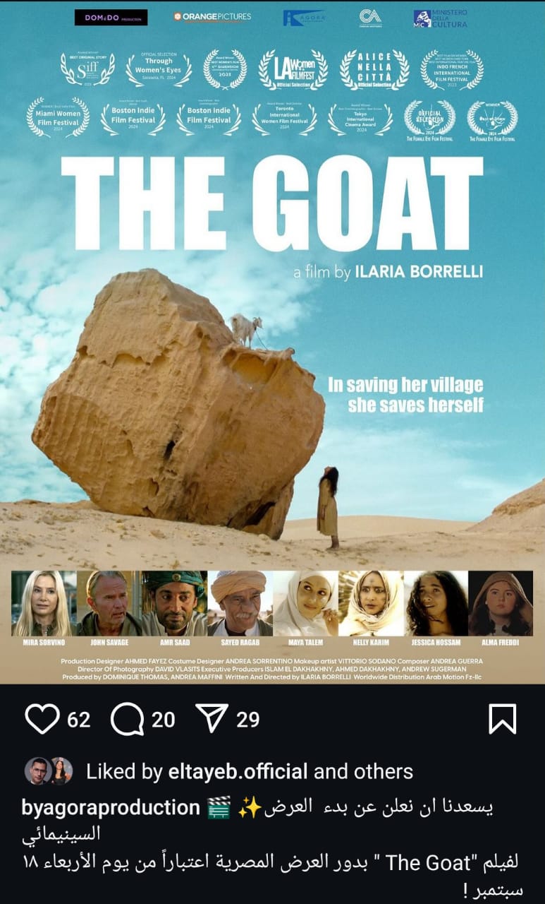 كما بدأ اليوم العرض الأول لفيلم "The Goat" في دور العرض السينمائية بمصر وذلك بعد حصول الفيلم على عدة جوائز بالمهرجانات العالمية، وذلك حيث بدأت الشركة المنتجة للترويج للفيلم خلال الساعات الماضية، حيث نشرت الشركة المنتجة على الصفحة الرسمية عبر موقع تبادل الصور والفيديوهات "إنستجرام" وعلقت قائلة : "يسعدنا أن نعلن عن بدء العرض السينمائي لفيلم The Goat بدور العرض المصرية اعتبارا من اليوم 18 سبتمبر" .