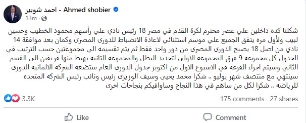 كتب أحمد شوبير: "شكلنا كده داخلين علي عصر محترم لكرة القدم في مصر 18 رئيس نادي علي رأسهم محمود الخطيب وحسين لبيب ولأول مره يتفق الجميع علي موسم استثنائي لاعادة الانضباط للدورى المصرى وكمان بعد موافقة 14 نادي من اصل 18 يصبح الدورى المصرى من دور واحد فقط ثم يتم تقسيمه الي مجموعتين حسب الترتيب في الجدول كل مجموعه 9 فرق المجموعه الاولي لتحديد البطل والمجموعه التانيه يهبط منها فريقين الي القسم الثاني وسيتم اجراء القرعه في الاسبوع الاول من اكتوبر جدول الدورى العام ستضعه الشركه الالمانيه الدورى سينتهي مع منتصف شهر يوليو .. شكرا محمد يحيى وسيف الوزيرى رئيس ونائب رئيس الشركه المتحده للرياضة.. شكرا لكل من ساهم في هذا النجاح وساوافيكم بنجاحات اخرى".