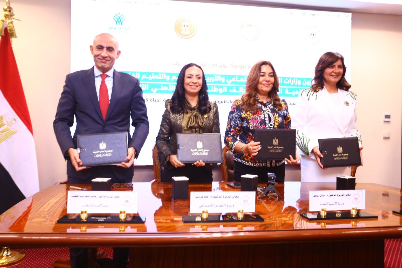 في إطار المبادرة الرئاسية " بداية جديدة لبناء الإنسان" وقعت الدكتورة مايا مرسي وزيرة التضامن الاجتماعي، والسيد محمد عبداللطيف وزير التربية والتعليم والتعليم الفني، والدكتورة منال عوض وزيرة التنمية المحلية، والسفيرة نبيلة مكرم رئيس الأمانة الفنية للتحالف الوطني للعمل الأهلي التنموي بروتوكول تعاون مشترك، وذلك بمقر وزارة التضامن الاجتماعي بالعاصمة الإدارية الجديدة.
