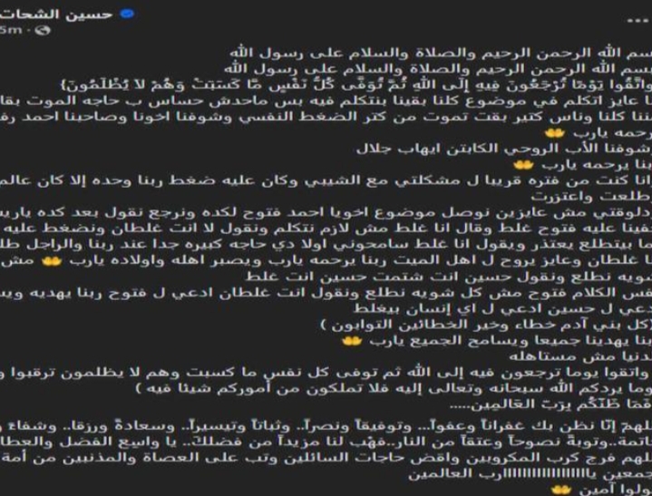 كتب حسين الشحات عبر صفحتة الرسمية عبر موقع التواصل الإجتماعي فيسبوك: أنا عايز أتكلم في موضوع كلنا بقينا بنتكلم فيه بس ماحدش حساس بحاجه الموت بقا قريب مننا كلنا وناس كتير بقت تموت من كتر الضغط النفسي وشوفنا أخونا وصاحبنا أحمد رفعت ربنا يرحمه يارب.