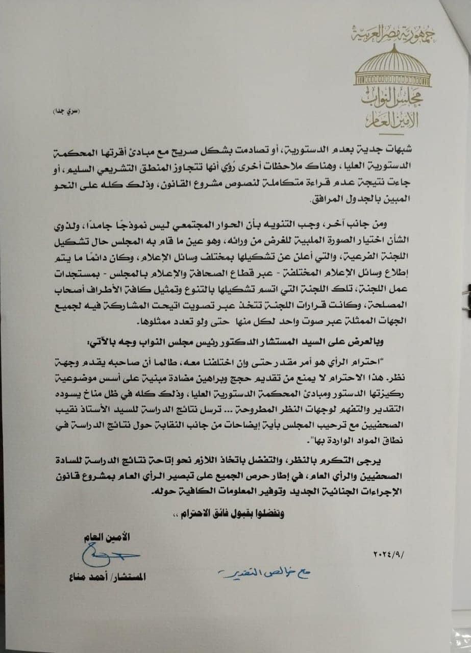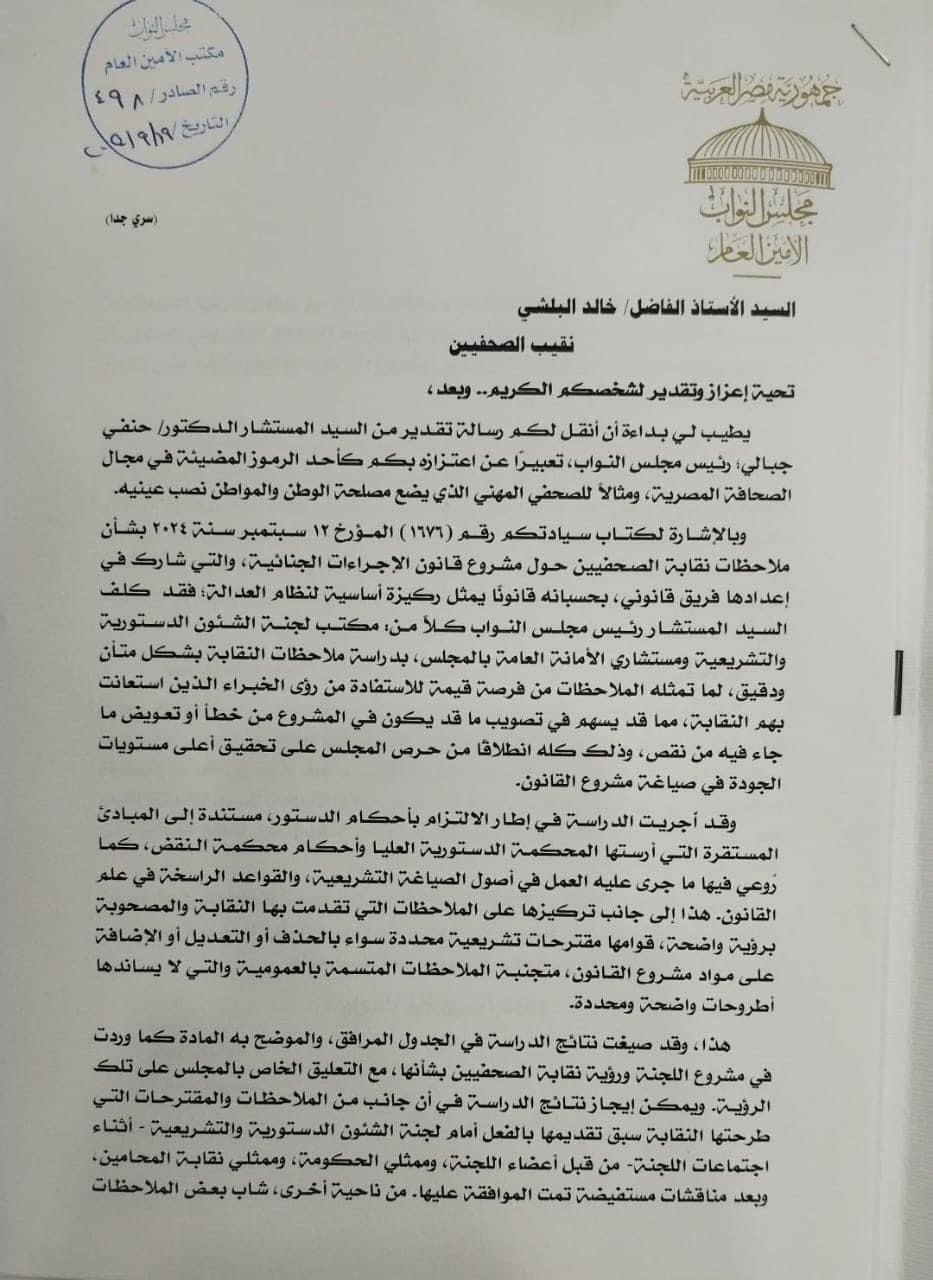 حصلت نقابة الصحفيين على رد من مجلس النواب حول ملاحظات النقابة على قانون الإجراءات الجنائية مع نهاية يوم عمل اليوم الخميس.
