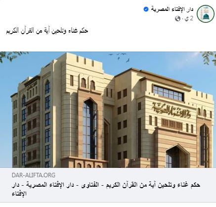 وشددت دار الإفتاء، على أن إخضاع القـرآن الكريم للنغمات الموسيقية، وقراءته قراءة مصحـوبة بالآلات الموسيقية، والتغني به محرم شرعًا، وأوضحت الدار ردًّا على ما تم تداوله من قيام بعض الأفراد بالتغني بآيات الذكر الحكيم مصحوبة بالآلات الموسيقية، أن القرآن الكريم هو كلام رب العالمين، أنزله الله على الرسول -صلى الله عليه وسلم- هدى للناس وبينات من الهدى والفرقان، ولم ينزله ليطرب به الناس أو يتغنوا به وقد أمر الله المسلمين بفهم معانيه وتدبر ما فيه من عظات وآداب بكل أحكامه.