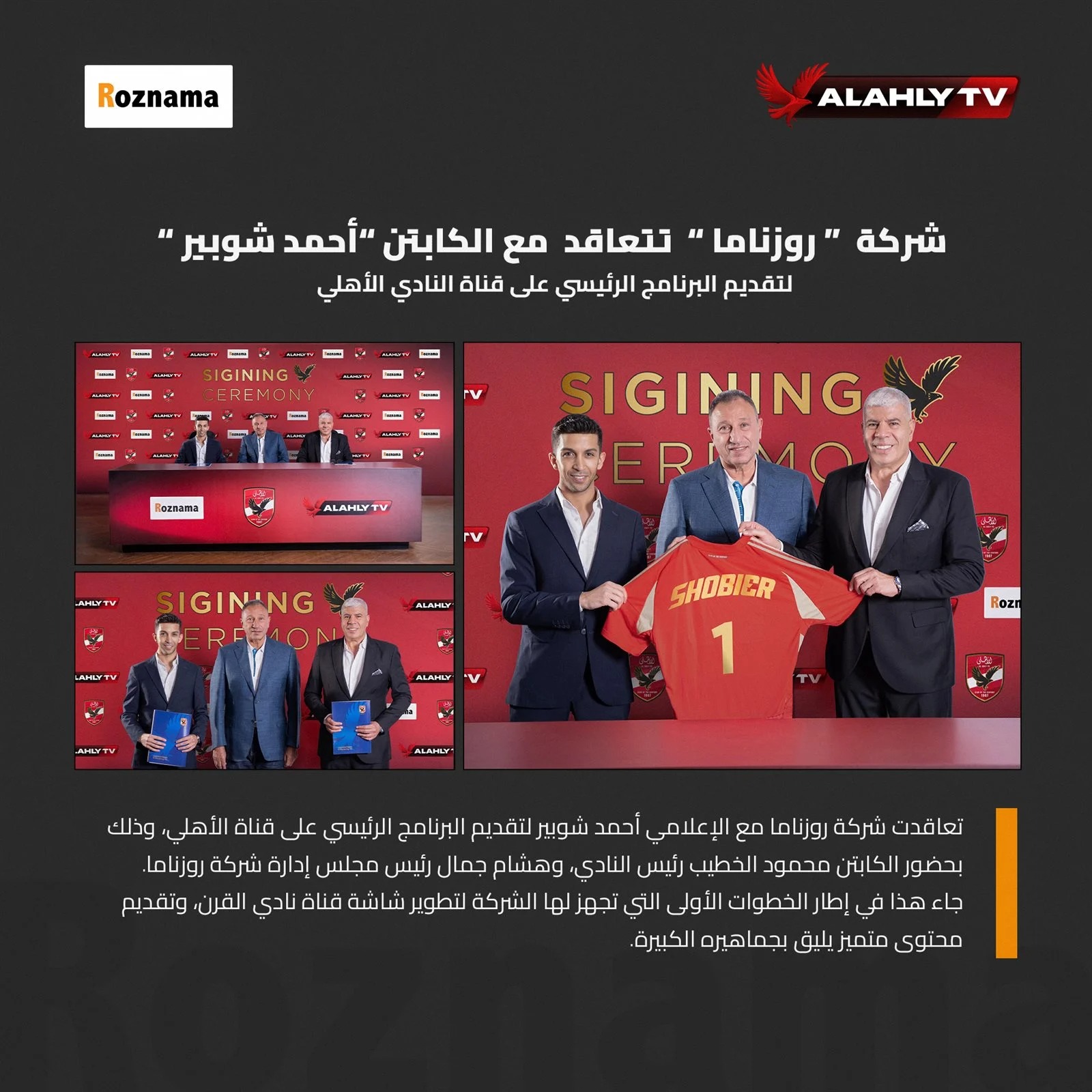 وتعاقدت شركة روزناما مع الإعلامي أحمد شوبير، لتقديم البرنامج الرئيسي على قناة الأهلي، وذلك بحضور محمود الخطيب رئيس النادي، وهشام جمال رئيس مجلس إدارة شركة روزناما، جاء هذا في إطار الخطوات الأولى التي تجهز لها الشركة لتطوير شاشة قناة نادي القرن، وتقديم محتوى متميز يليق بجماهيره الكبيرة.