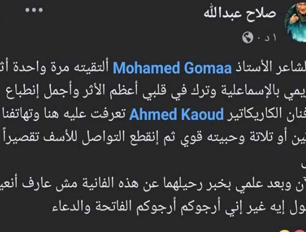 وأضاف:"وفنان الكاريكاتير أحمد قاعود تعرفت عليه هنا وتهاتفنا مرتين أو ثلاثة وحبيته قوى ثم اقطع التواصل للاسف تقصيرًا منى والآن وبعد علمي بخبر رحيلهما عن هذه الفانية مش عارف أنعيهم وأقول إيه غير إنى أرجوكم قراءة الفاتحة والدعاء".