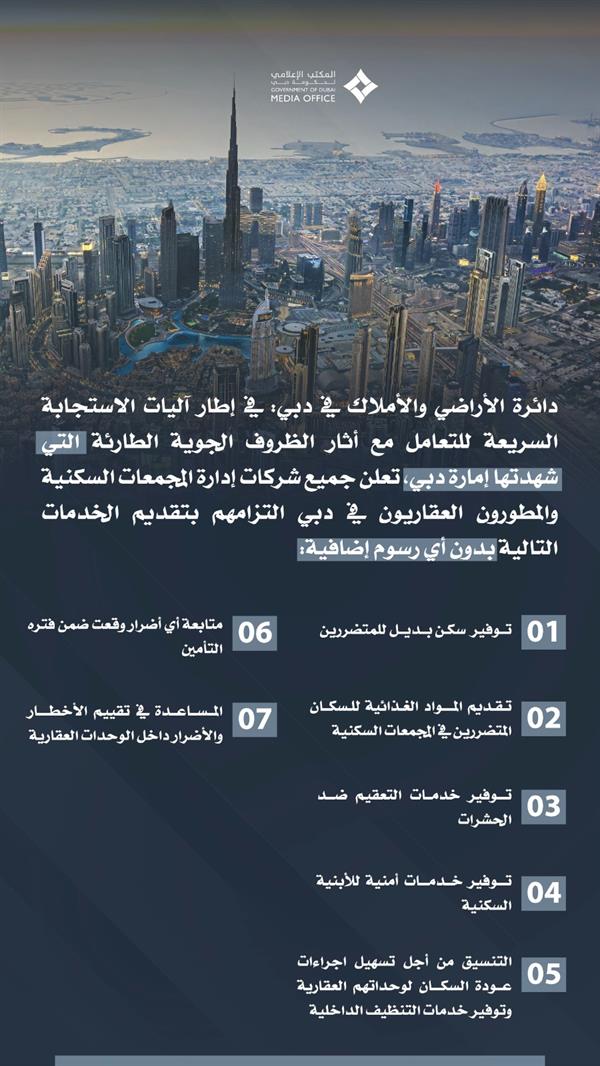بعد الظروف الجوية التي تعرضت لها إمارة دبي، كشفت دائرة الأراضي والأملاك في دبي، عن التزام جميع شركات إدارة المجمعات السكنية والمطورين العقاريين في الإمارة بتقديم خدمات جديدة بدون أي رسوم إضافية، في تحرك عاجل وسريع للحفاظ على حقوق العملاء واحترام التعاقدات.