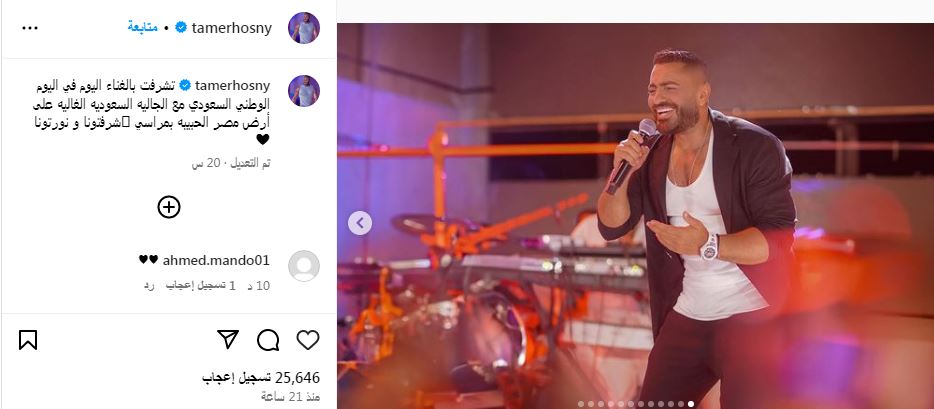 وعبّر من خلالها عن سعادته بالمشاركة في هذه الاحتفالات، وكتب تامر معلّقاً على الصور: "تشرّفت بالغناء في العيد الوطني السعودي مع الجالية السعودية الغالية على أرض مصر الحبيبة بمراسي، شرّفتونا ونوّرتونا".