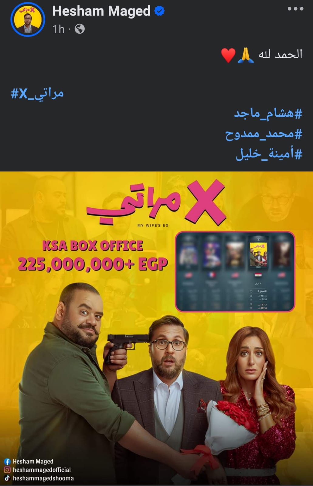 أعلن الفنان هشام ماجد منذ قليل، عن تحقيق فيلم "إكس مراتي" إيرادات هائلة في الشباك التذاكر السعودي وذلك بتحقيقه إيرادات بلغت 225 مليون جنيها .