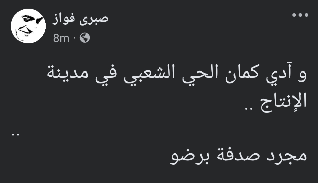 حريق مدينة الانتاج الإعلامي، كتب صبري فواز منشورا على صفحته الرسمية عبر موقع التواصل الاجتماعي "فيسبوك" وعلق قائلا : "و آدي كمان الحي الشعبي في مدينة الإنتاج، مجرد صدفة برضه" .