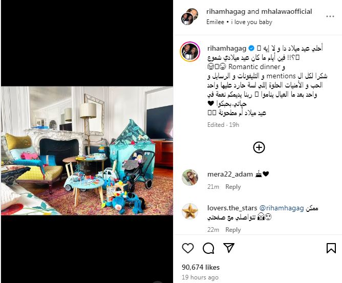 ونشرت ريهام صورة لألعاب طفليها، عبر حسابها الرسمي بموقع "انستجرام"، وكتبت: "أحلى عيد ميلاد دا ولا إيه؟!، فين أيام ما كان عيد ميلادي شموع وعشاء رومانسي".