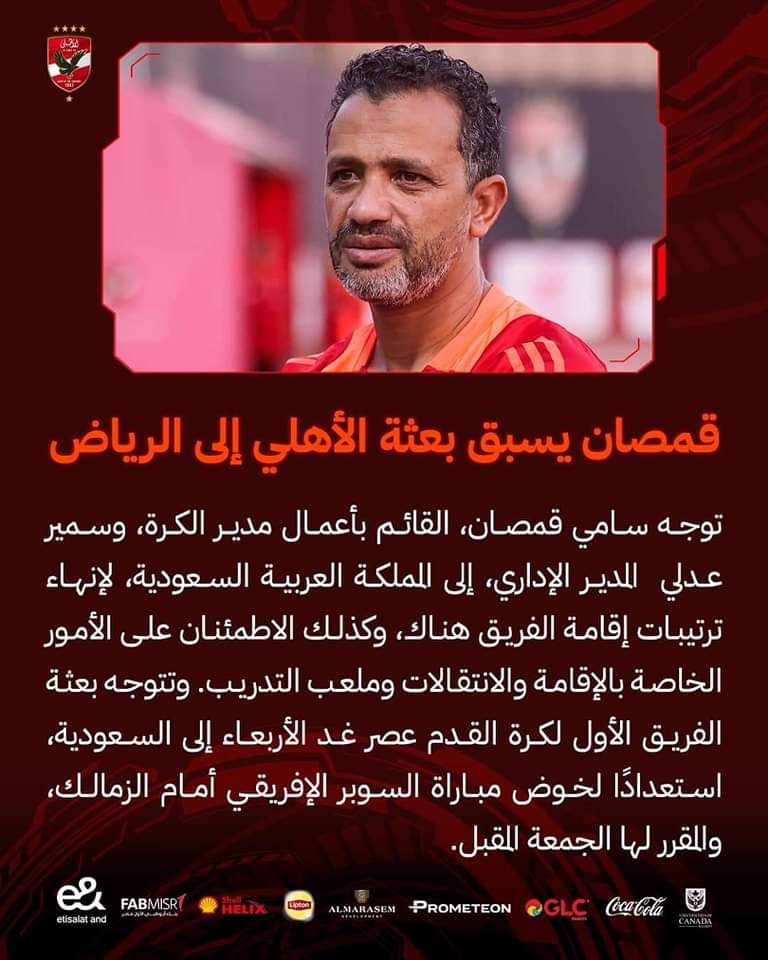 وذكر النادي الأهلي في بيان رسمي أن سفر سامي قمصان وسمير عدلي جاء من أجل إنهاء ترتيبات الإقامة في العاصمة السعودية الرياض، بالإضافة إلى الإطمئنان على الأمورالخاصة بالإقامة والانتقالات وملاعب التدريب.