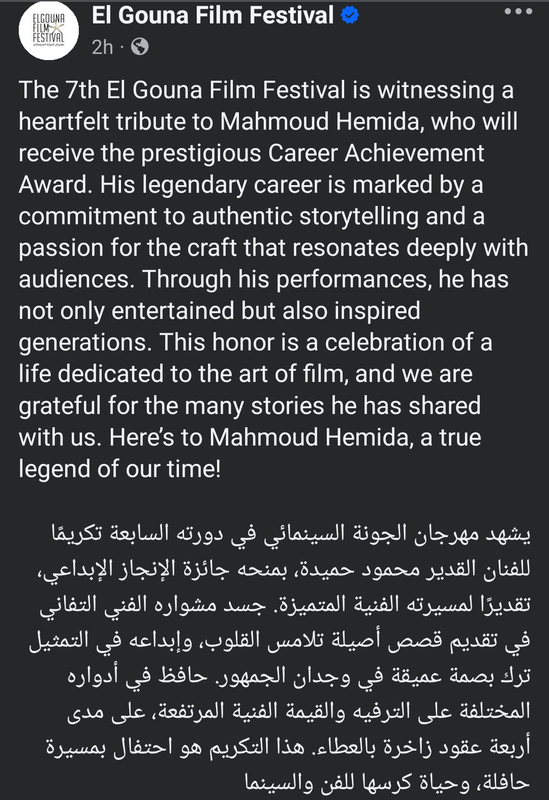 نشرت إدارة مهرجان الجونة السينمائي الدولي بيانا على الصفحة الرسمية عبر موقع التواصل الاجتماعي "فيسبوك" : "يشهد مهرجان الجونة السينمائي في دورته السابعة تكريمًا للفنان القدير محمود حميدة، بمنحه جائزة الإنجاز الإبداعي، تقديرًا لمسيرته الفنية المتميزة. جسد مشواره الفني التفاني في تقديم قصص أصيلة تلامس القلوب، وإبداعه في التمثيل ترك بصمة عميقة في وجدان الجمهور. حافظ في أدواره المختلفة على الترفيه والقيمة الفنية المرتفعة، على مدى أربعة عقود زاخرة بالعطاء. هذا التكريم هو احتفال بمسيرة حافلة، وحياة كرسها للفن والسينما" .