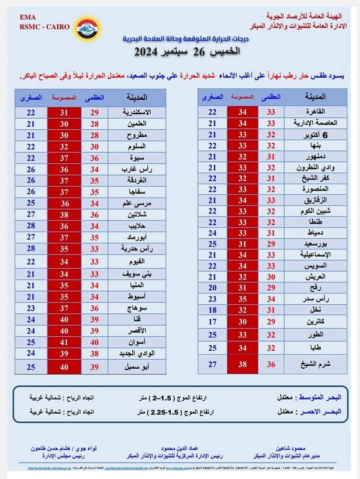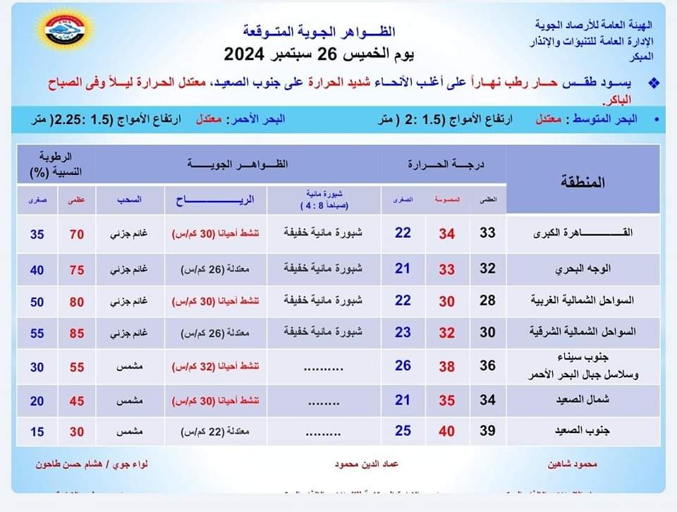 كشفت الهيئة العامة للأرصاد الجوية حالة الطقس غدًا الخميس، مشيرة إلى أجواء حارة رطبة غائمة على أغلب أنحاء البلاد نهارا، شديدة الحرارة على جنوب الصعيد ، ومعتدلة رطبة ليلا على كافة الأنحاء.