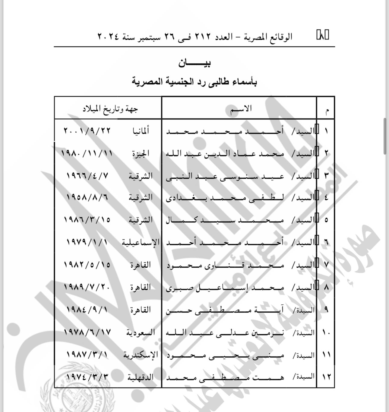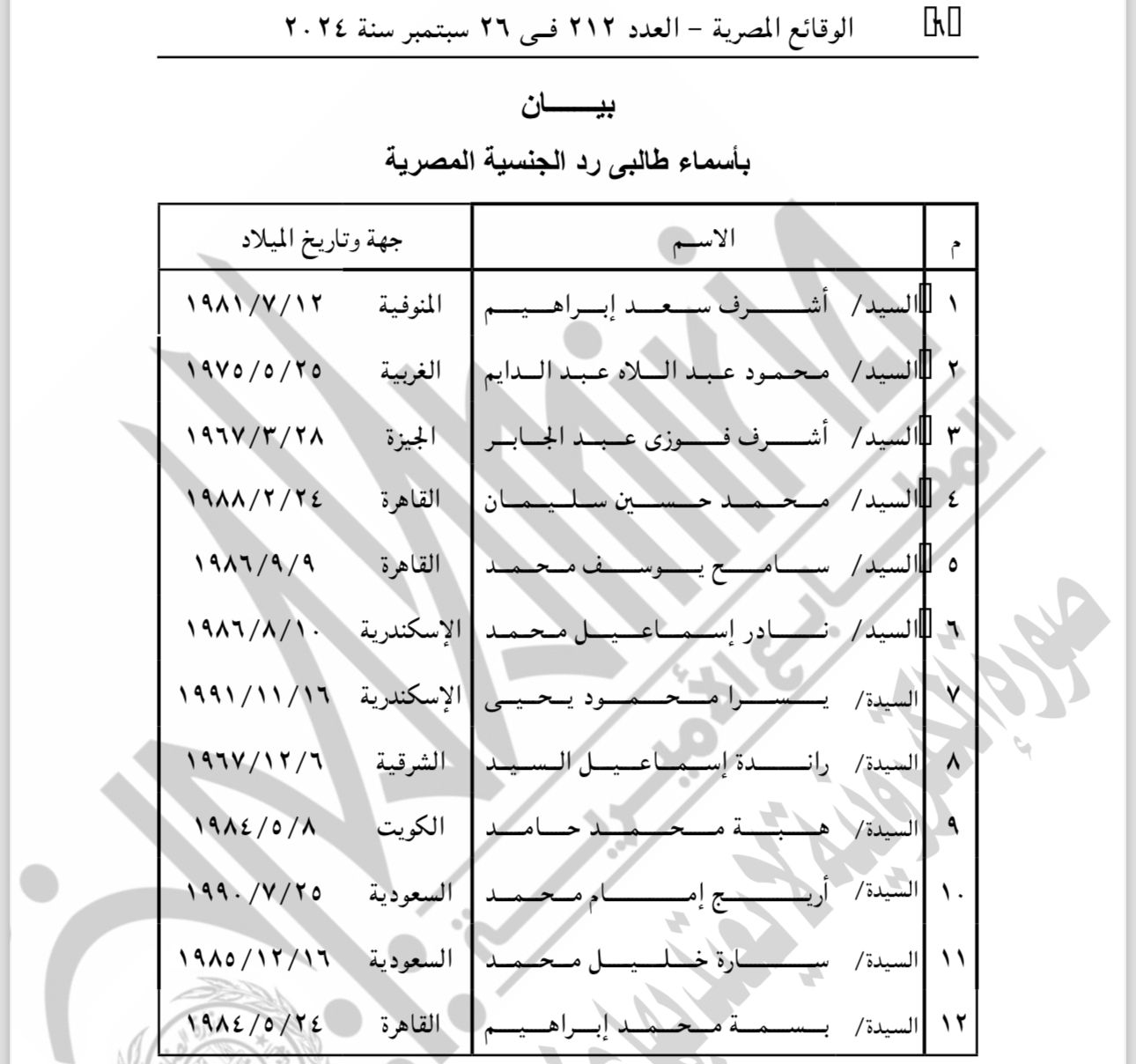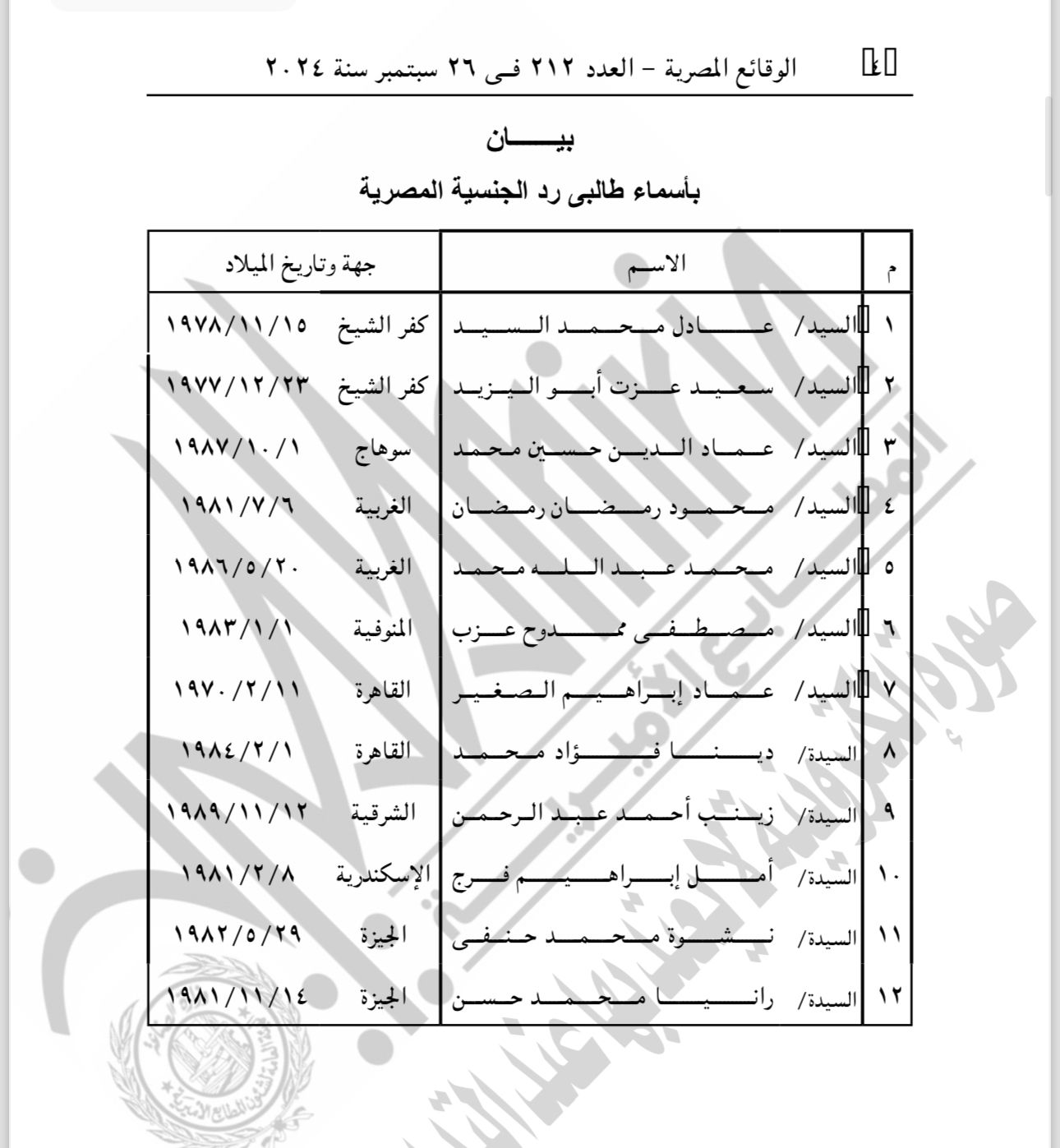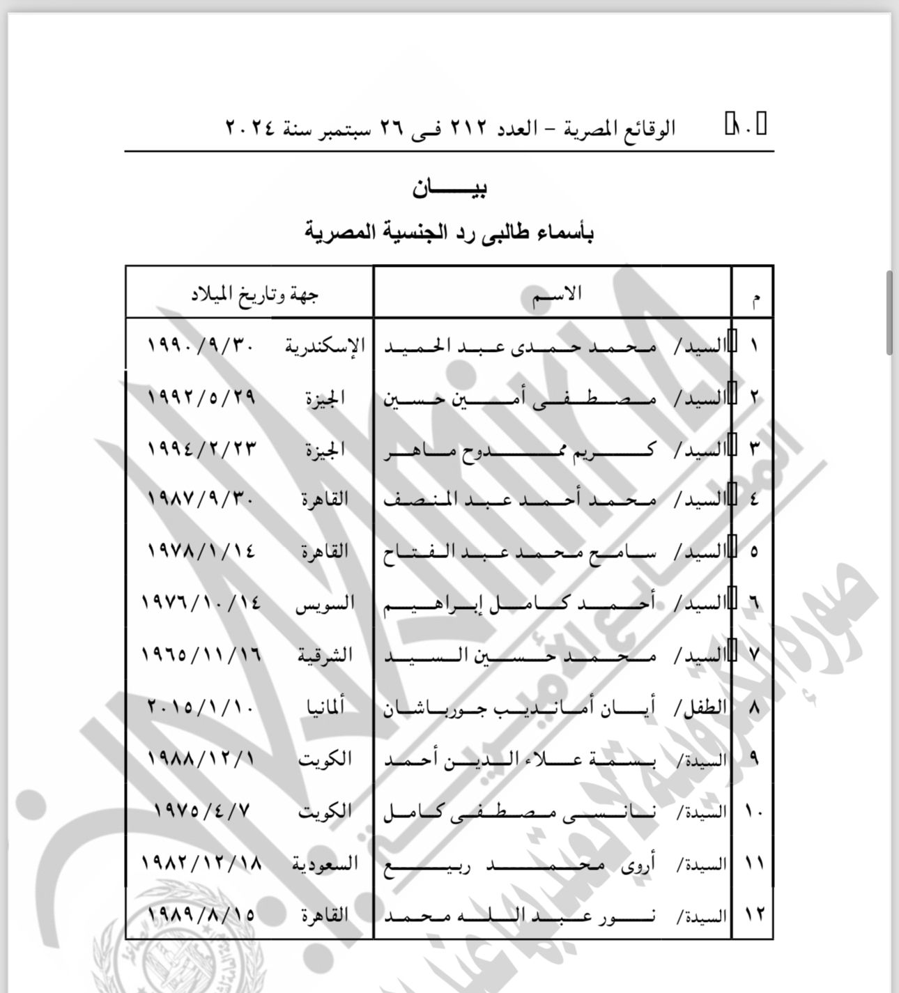 حمل القرار رقم 1608 لسنة 2024 ونص على "تُرد الجنسية المصرية لكل من الاثنى عشر شخصًا المدرجة أسماؤهم بالبيان المرفق (أولهم صالح محمد صالح وآخرهم لورين رضا جيمي).