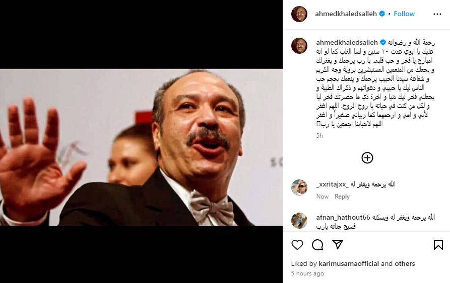 ووجه أحمد خالد رسالة مؤثرة لوالده عبر صفحته الرسمية "إنستجرام" وكتب "رحمة الله ورضوانه عليك يا أبويا، عدت 10 سنين ولسة القلب كما لو إنه امبارح يا فخر وحب قلبي، يا رب يرحمك ويغفرلك ويجعلك من المنعمين المستبشرين برؤية وجه الكريم، وشفاعة سيدنا الحبيب يرحمك".