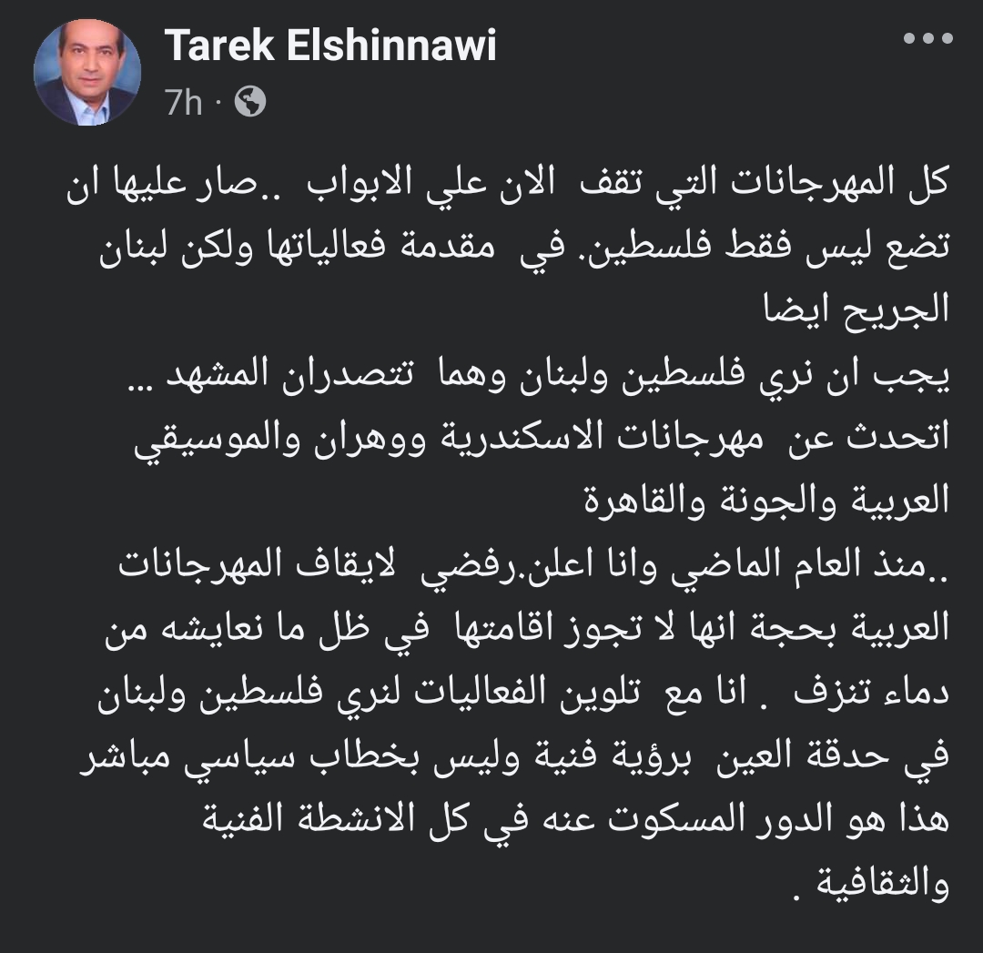 كتب طارق الشناوي منشورا على صفحته الرسمية عبر موقع التواصل الاجتماعي "فيسبوك" وعلق قائلا : "كل المهرجانات التي تقف الآن على الأبواب صار عليها أن تضع ليس فقط فلسطين في مقدمة فعالياتها ولكن لبنان الجريح أيضا" .