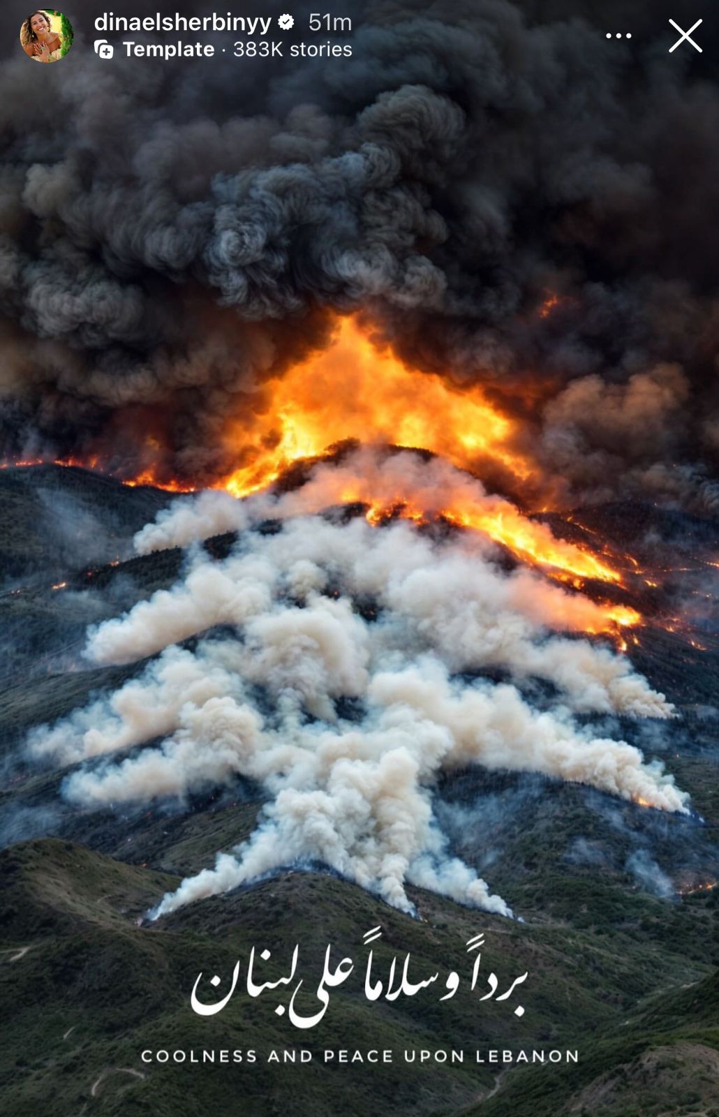 بينما نشرت دينا الشربيني ستوري على صفحتها الرسمية عبر موقع تبادل الصور والفيديوهات "إنستجرام" وعلقت قائلة : "بردا وسلاما على لبنان" .