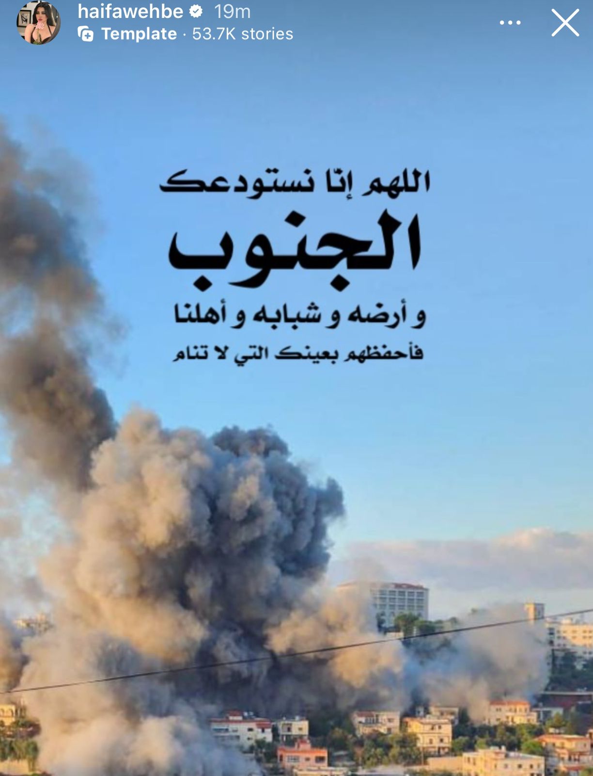 ونشرت هيفاء وهبي ستوري على صفحتها الرسمية عبر موقع تبادل الصور والفيديوهات "إنستجرام" وعلقت قائلة : "اللهم إنا نستودعك الجنوب وأرضه وشبابه وأهلنا، فاحفظهم بعينك التي لا تنام" .