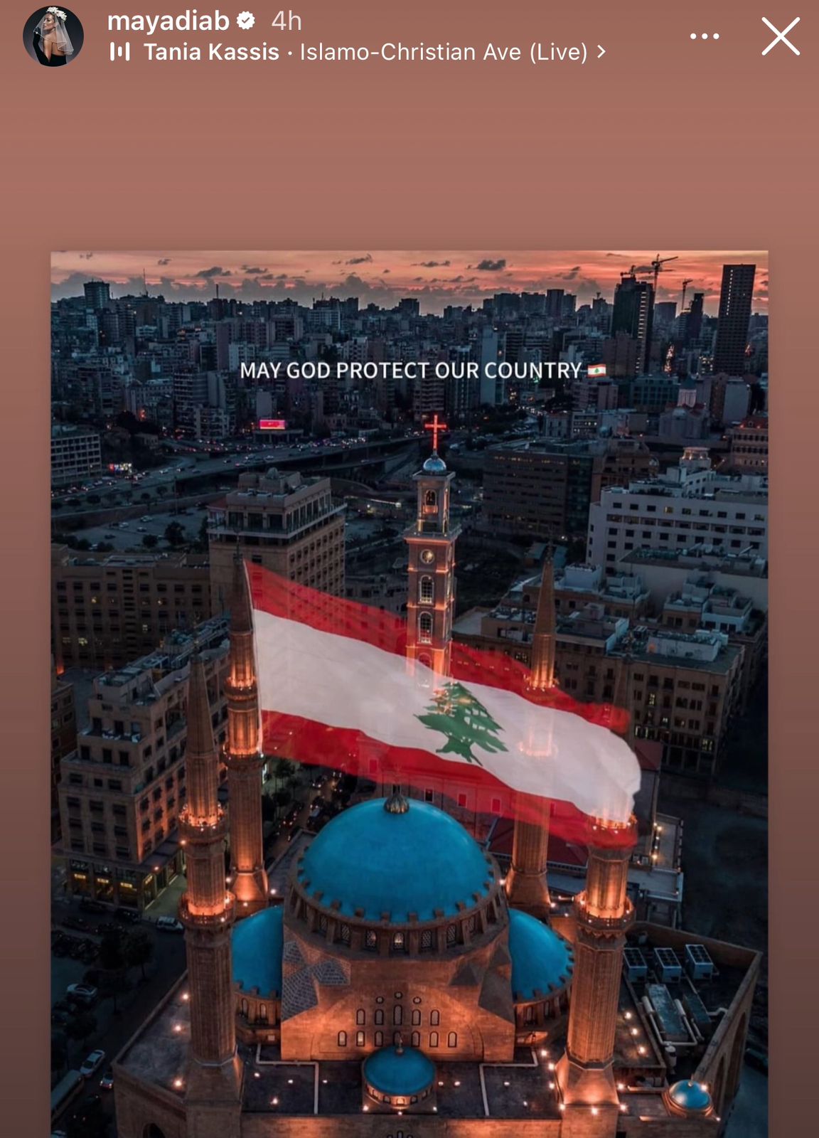 ونشرت مايا دياب ستوري على صفحتها الرسمية عبر موقع تبادل الصور والفيديوهات "إنستجرام" وعلقت قائلة : "نسأل الله أن يحفظ بلادنا" .