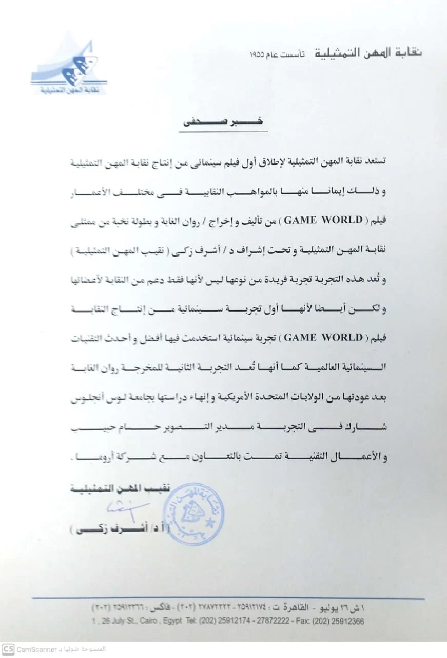 وفي سياق متصل، أعلنت نقابة المهن التمثيلية تحت رئاسة الدكتور أشرف زكي عن إطلاق أول فيلم سينمائي من إنتاج النقابة يحمل اسم "Game World" .