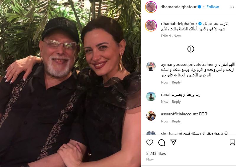 ونشرت ريهام عبدالغفور صورتها مع والدها، عبر حسابها الرسمي بموقع «انستجرام»، وعلقت قائلة: «لازلت معي في كل شيء إلا في واقعي، أسألكم الفاتحة والدعاء لأبي».