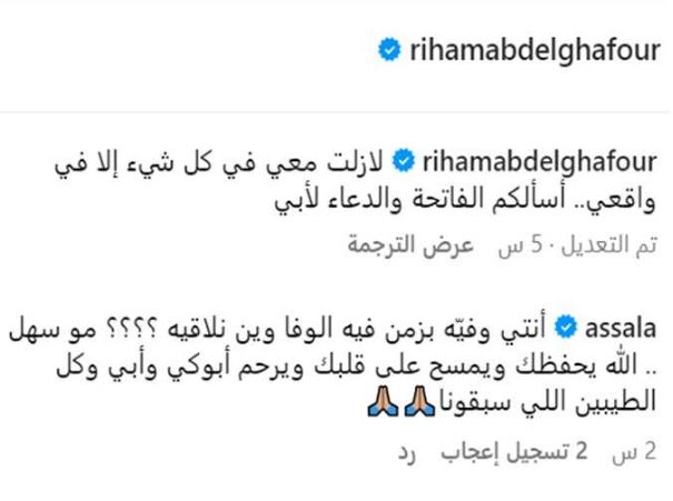 وعلقت أصالة على منشور ريهام عبدالغفور لـ والدها من خلال «التعليقات» قائلة: «انتي وفيّه بزمن فيه الوفا وين نلاقيه؟ مو سهل.. الله يحفظك ويمسح على قلبك ويرحم أبوكي وأبي وكل الطيبين اللي سبقونا».
