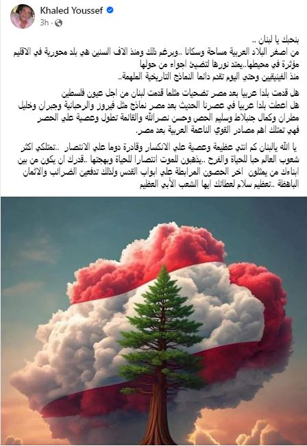 "تعظيم سلام لعطائك أيها الشعب الأبي العظيم" خالد يوسف يدعم لبنان بكلمات مؤثرة (صورة)