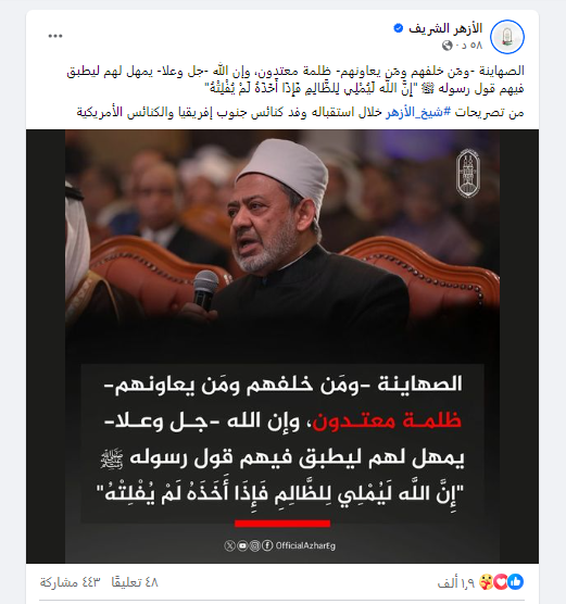 وجاء منشور الأزهر الشريف وهو عبارة عن تصريح فضيلة الأمام الأكبر الدكتور أحمد الطيب، شيخ الأزهر الشريف، حول حكم من يعاون دولة إسرائيل وتأييد موقفها قائلًا: "الصهاينة -ومَن خلفهم ومَن يعاونهم- ظلمة معتدون، وإن الله -جل وعلا- يمهل لهم ليطبق فيهم قول رسوله ﷺ إِنَّ اللَّه لَيُمْلِي لِلظَّالِمِ فَإِذَا أَخَذَهُ لَمْ يُفْلِتْهُ".