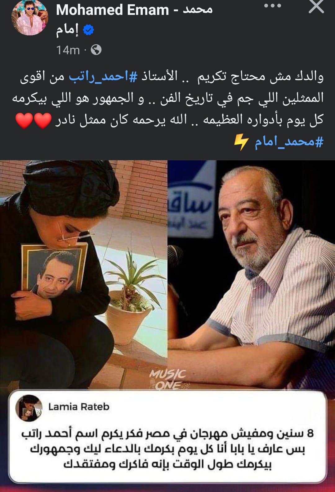 كتب محمد إمام منشورا على صفحته الرسمية عبر موقع التواصل الاجتماعي "فيسبوك" وعلق قائلا : "والدك مش محتاج تكريم، الأستاذ أحمد راتب من أقوى الممثلين اللي جم في تاريخ الفن، والجمهور هو اللي بيكرمه كل يوم بأدواره العظيمة، الله يرحمه كان ممثل نادر" .