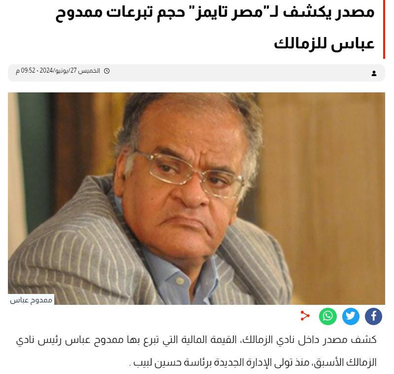 وقال هشام نصر، خلال لقاء تليفزيوني، إن ممدوح عباس تبرع بأكثر من 120 مليون جنيه خلال الفترة الماضية لنادي الزمالك|، جاء ذلك تأكيدًا لما نشره "مصر تايمز" بتاريخ 27 يونيو 2024، تحت عنوان "مصدر يكشف لـ"مصر تايمز" حجم تبرعات ممدوح عباس للزمالك".