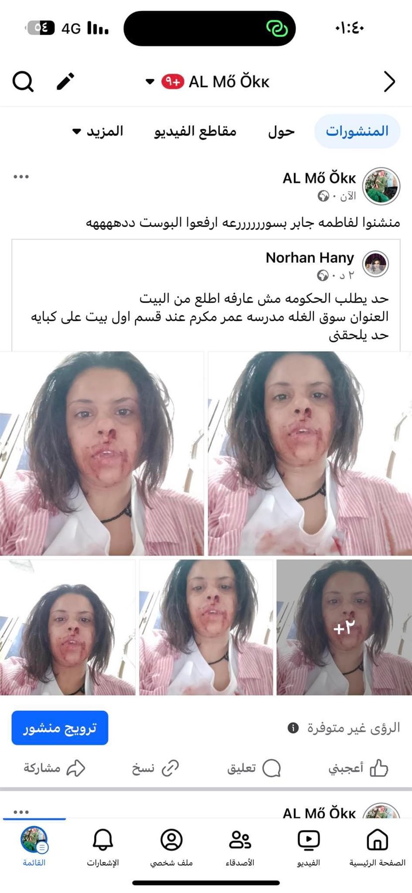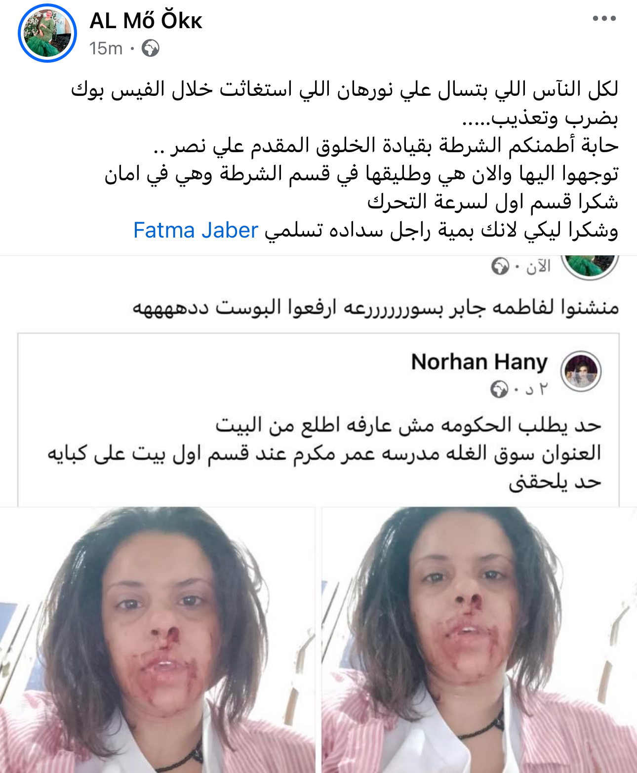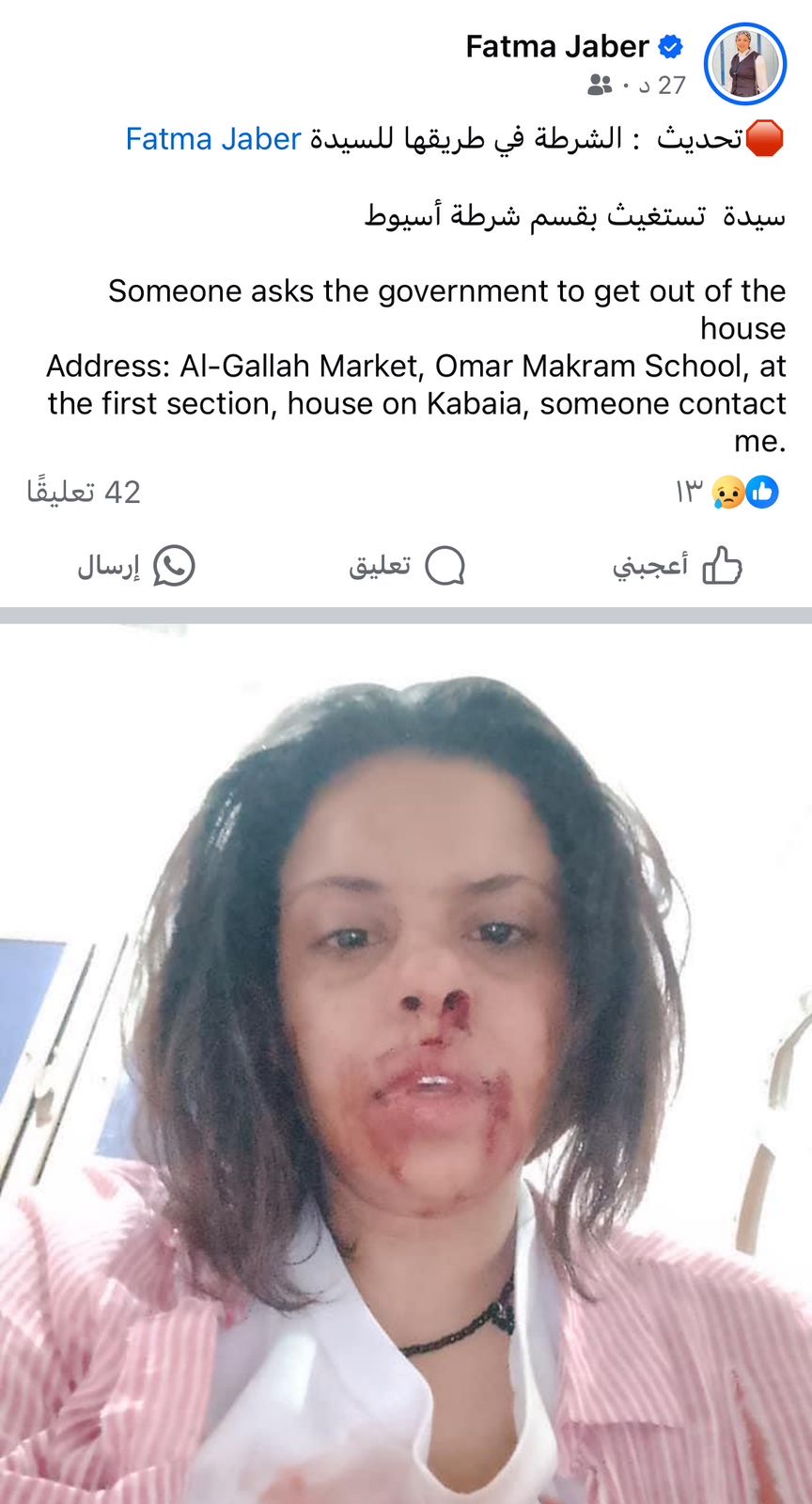 تداول رواد مواقع التواصل الاجتماعى ، صور لسيدة من أسيوط تستغيث بقسم شرطة أسيوط، وهى ملطخة بالدماء دون الكشف عن سبب حالتها.
