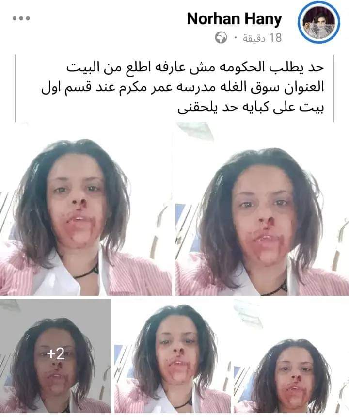 في منشور مؤثر، طالبت السيدة، التي تدعى "نورهان هاني"، المساعدة من السلطات، موضحة أنها لا تستطيع الخروج من منزلها، حيث كتبت: "حد يطلب الحكومة مش عارفة أطلع من البيت العنوان سوق الغلة مدرسة عمر مكرم عند قسم أول بيت على كباية حد يلحقني". وأظهرت الصورة التي نشرتها آثار دماء على وجهها وأنفها، مما أثار قلق المتابعين ودفعهم للتفاعل مع منشورها.