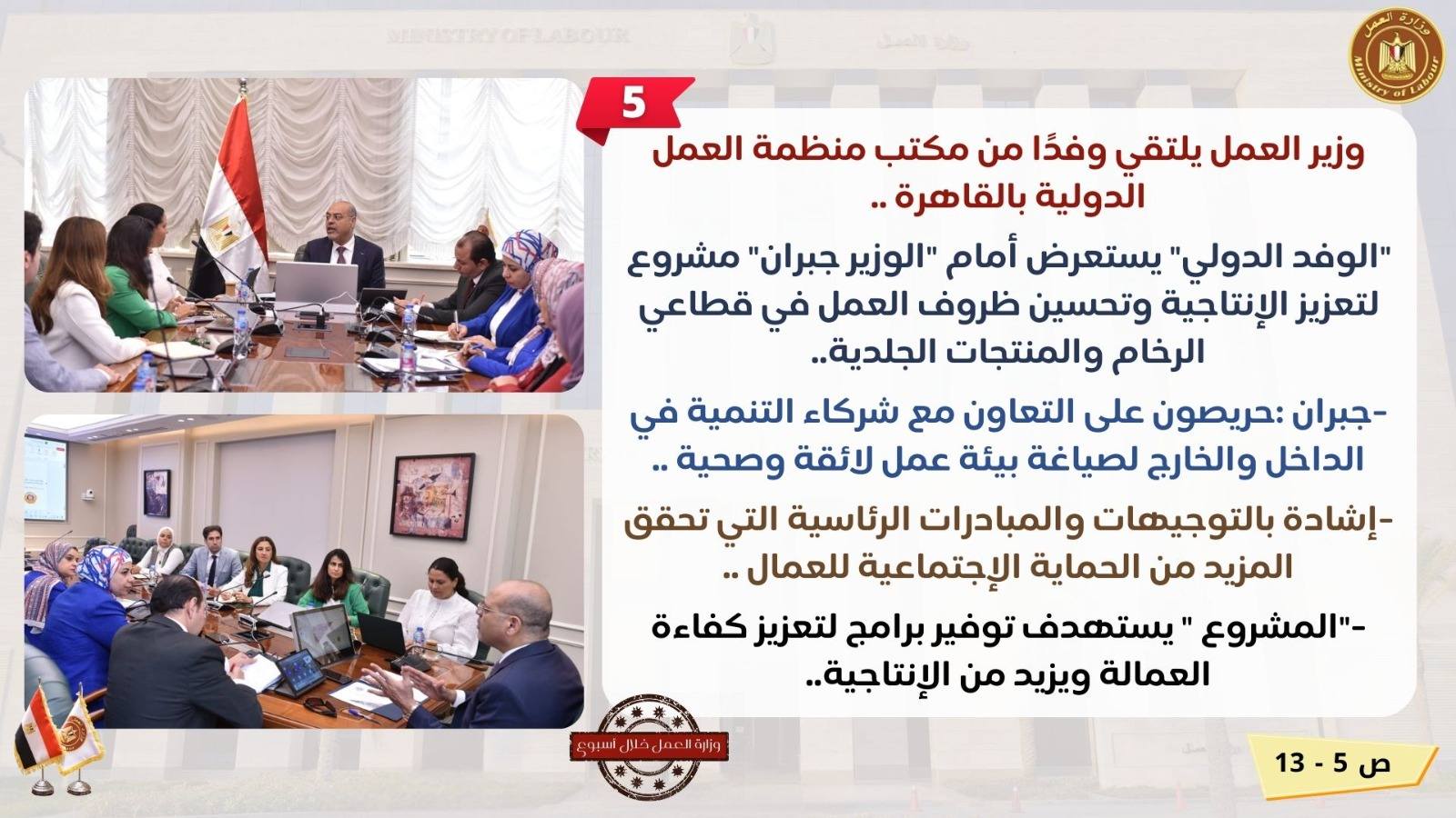 وكان من أبرز الأنشطة ،استقبال الوزير ،رئيس إتحاد الصناعات المصرية المهندس محمد زكي السويدي ، وذلك لبحث مجموعة من الملفات ذات الإهتمام المُشترك بين "الوزارة" و"الإتحاد" ،حيث أكد الجانبان على أهمية تكثيف التعاون ،والتنسيق في بعض قضايا العمل من بينها مشروع قانون العمل ،بما يُحقق المزيد من الأمان الوظيفي للعامل ،ويُشجع على "الإستثمار"،وكذلك تطبيق الحد الأدنى للرواتب،تنفيذًا لقرار المجلس القومي للأجور .. كما أعلن وزير العمل هذا الأسبوع عن بدء الإختبارات،بشأن الاستفادة من "برنامج تدريب وتوظيف" ،والخاص بذوي الهمم ،وذلك بالتعاون مع الجامعة الأمريكية.