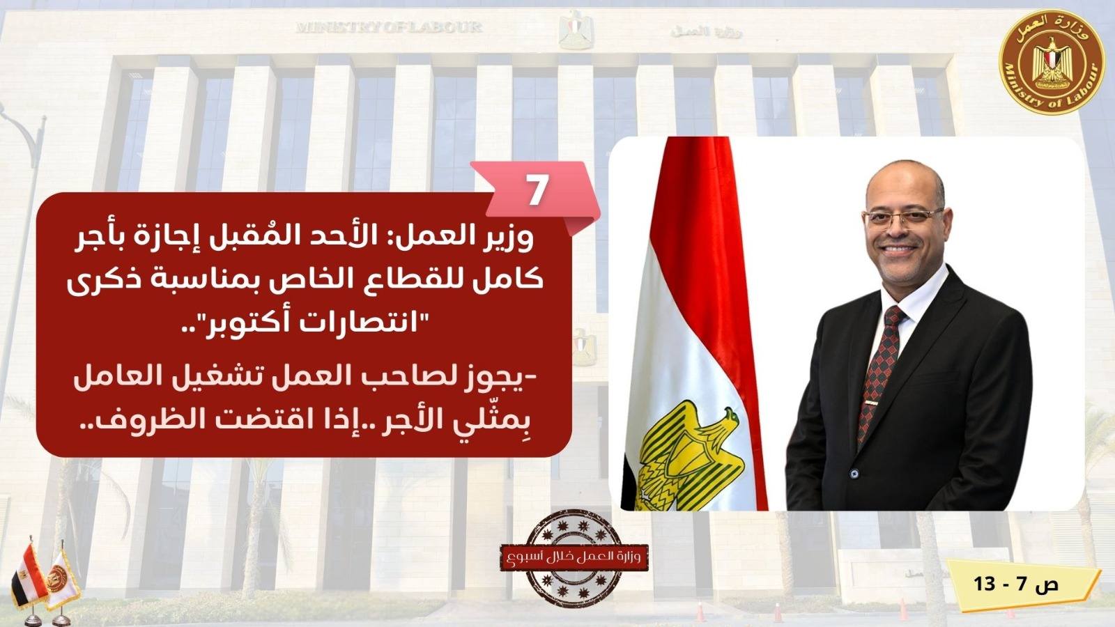 وأعلن الوزير محمد جبران عن أن غداً الأحد الموافق 6 أكتوبر 2024 ،إجازة بأجر للعاملين بالقطاع الخاص بمناسبة الاحتفال بالذكرى الواحد والخمسين لإنتصارات أكتوبر المجيدة ،وذلك في إطار صدور قرار رئيس مجلس الوزراء رقم 3230 لسنة 2024...وتستمر مديريات العمل في كافة المحافظات في تنفيذ أهداف المبادرة الرئاسية "بداية جديدة لبناء الإنسان " من خلال أنشطة خاصة بالتوظيف والتدريب المهني ونشر ثقافة السلامة والصحة المهنية،وغيرها ..إلى "الانفوجراف"..